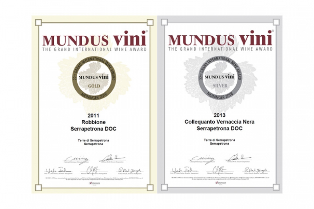 Riconoscimenti importanti, in questi giorni, per i vini Terre di Serrapetrona durante il Concorso Internazionale MUNDUS VINI 2018. Robbione Serrapetrona Doc 2011 si è aggiudicato la medaglia d'oro, mentre Collequanto Vernaccia Nera Serrapetrona Doc 2013 la medaglia d'argento.